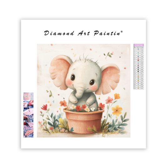 Glad elefant i en blomkruka - Diamantmålning