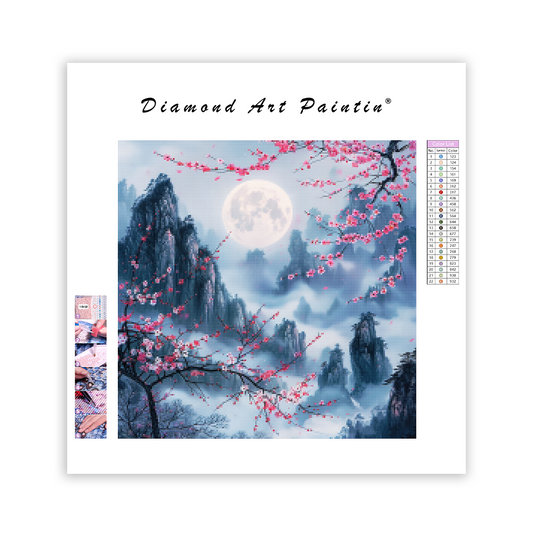 Čerešňový kvet, mesačné svetlo, horská krajina - Diamantmålning