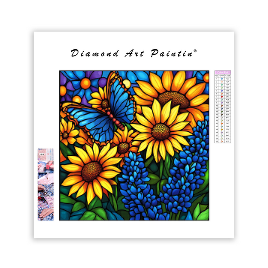 Solrosor och fjäril i målat glas - Diamantmålning